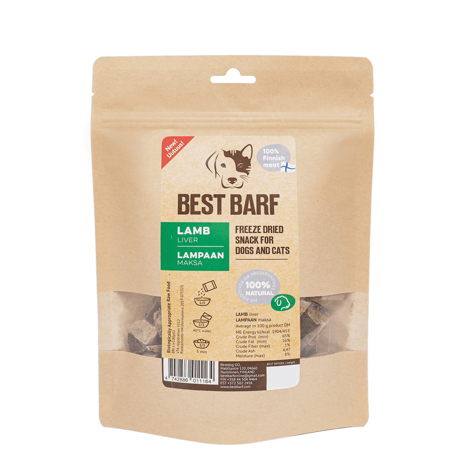 Best Barf liofilizuotos ėriuko kepenys – tai sveikas užkandis ar skanėstas skirtas šunims ar kitiems mėsėdžiams augintiniams. Dėl liofilizacijos proceso šie skanėstai išlaiko šviežios žalios mėsos maistinę vertę ir skonį.