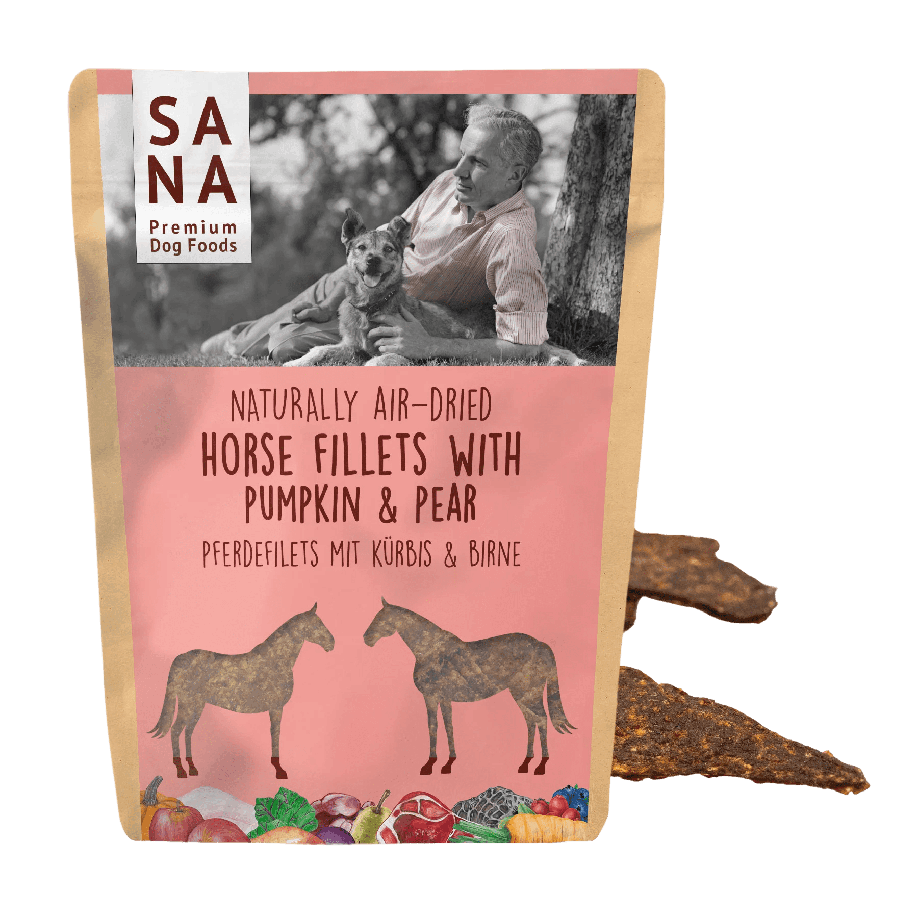 SANA DOG arklienos paplotėliai su moliūgu ir kriauše yra skanėstas jūsų šuniui iš grynos, aukštos kokybės arklienos ir sveiko supermaisto. Jie gaminami be priedų, tokių kaip kukurūzai, kviečiai, soja, dažikliai, konservantai, mėsos miltai ar kiti užpildai, ir švelniai džiovinami ore. SANA DOG džiovinimo ore technologija yra moderni šimtmečių senumo mėsos konservavimo metodų interpretacija.